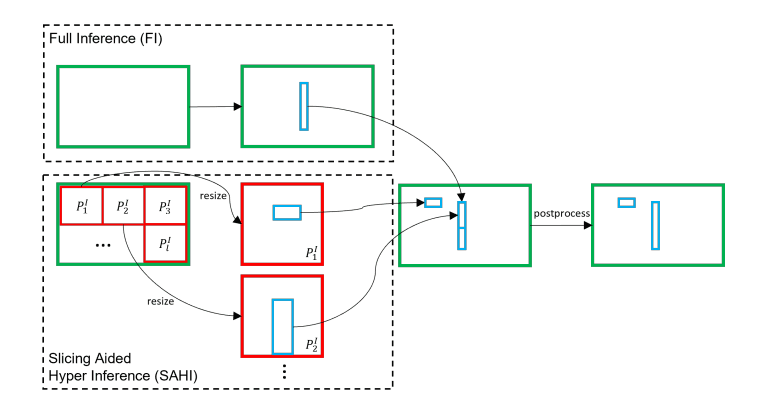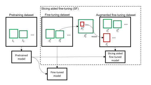 What about the ‘Slicing Aided Fine-tuning‘ approach? As the name suggests, it is about training. Before training, slice images into smaller patches, resize these patches to a larger resolution, and then train an object detection model on these newly created larger resolution patches and on the full image. You can approach this intuitively because it makes a lot of sense. You have a super-small object in a high-resolution image. First, you divide this image into smaller patches, then resize these smaller patches to higher resolutions. By doing that, your super-small object becomes larger, and then you train an object detection model on these patches, so accuracy increases for small object detection.