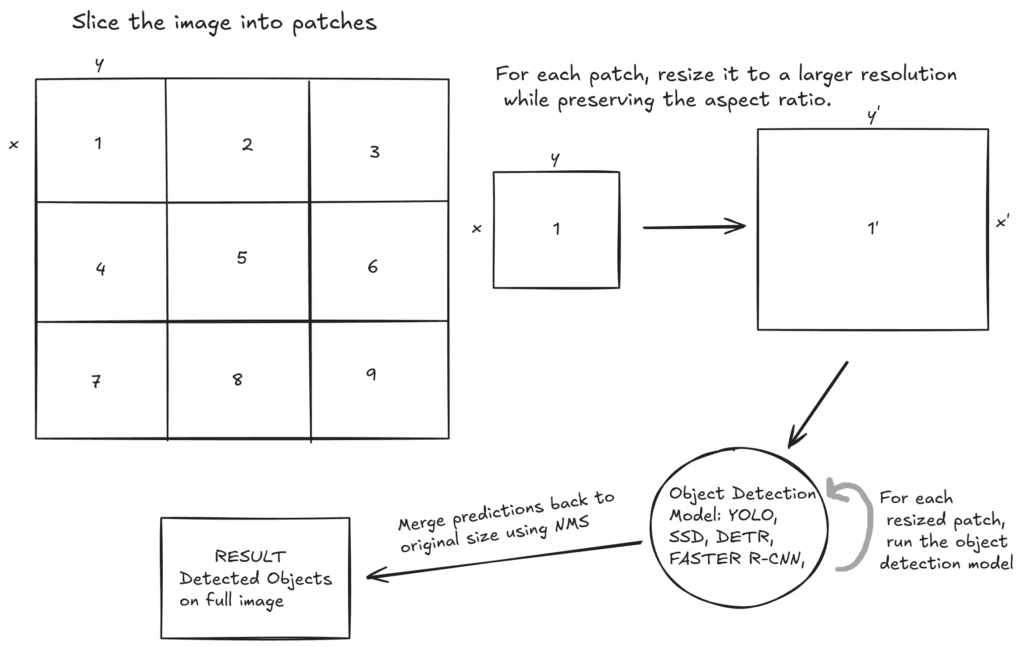 Till now, I have already given you the main idea behind the first approach, but there is more. Okay, we have an image, and we slice it into smaller patches. The important thing is to resize these smaller patches to higher resolutions. By doing that, our small patch becomes bigger, and the object inside it becomes bigger. Then, the object detection model runs on these newly generated higher-resolution patches. For small objects, this approach makes sense, especially for small objects in high-resolution images.