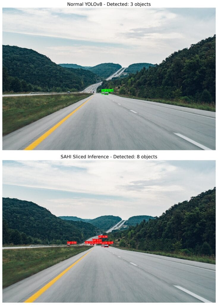 First, create an instance of UltralyticsDetectionModel class to load your YOLO model, then use get_sliced_prediction function for inference. I used pretrained YOLO model (yolov8n.pt). If you want to use SAHI with a custom model or any other pretrained model, nothing changes.