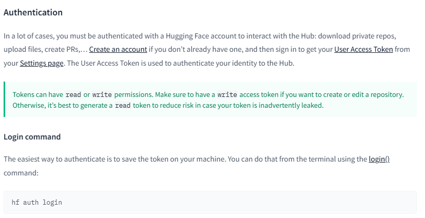 Authentication, create a token then paste ‘hf auth login’ into the terminal