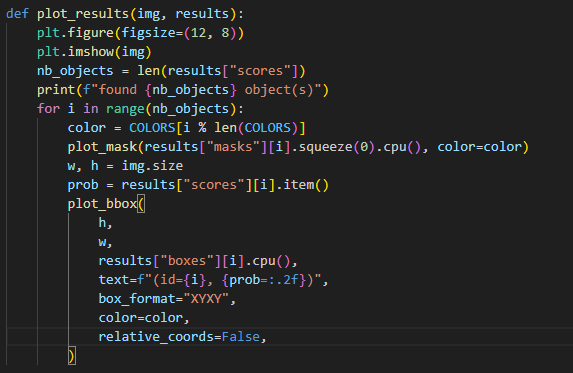 You can directly use the plot_results function for displaying the result, or you can loop through the masks, scores, and boxes and display them depending on what you want to see(mask, label, confidence).
