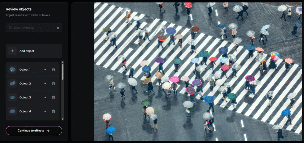 First two demos are for segmenting objects with text prompts on images and videos. Text prompt can be a word or a sentence. For example, in the below image my prompt (top left) was “black umbrella”.